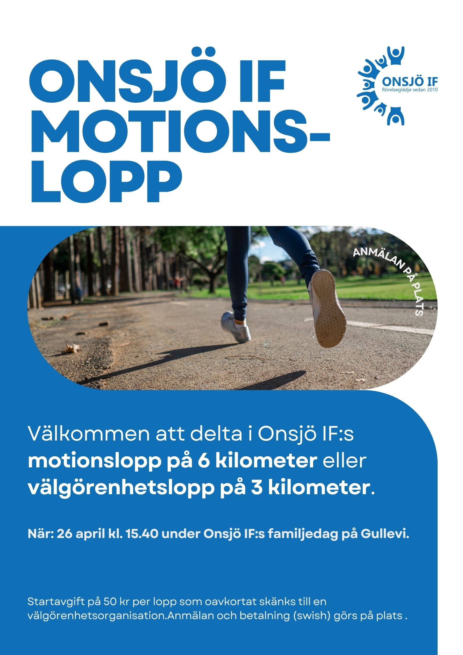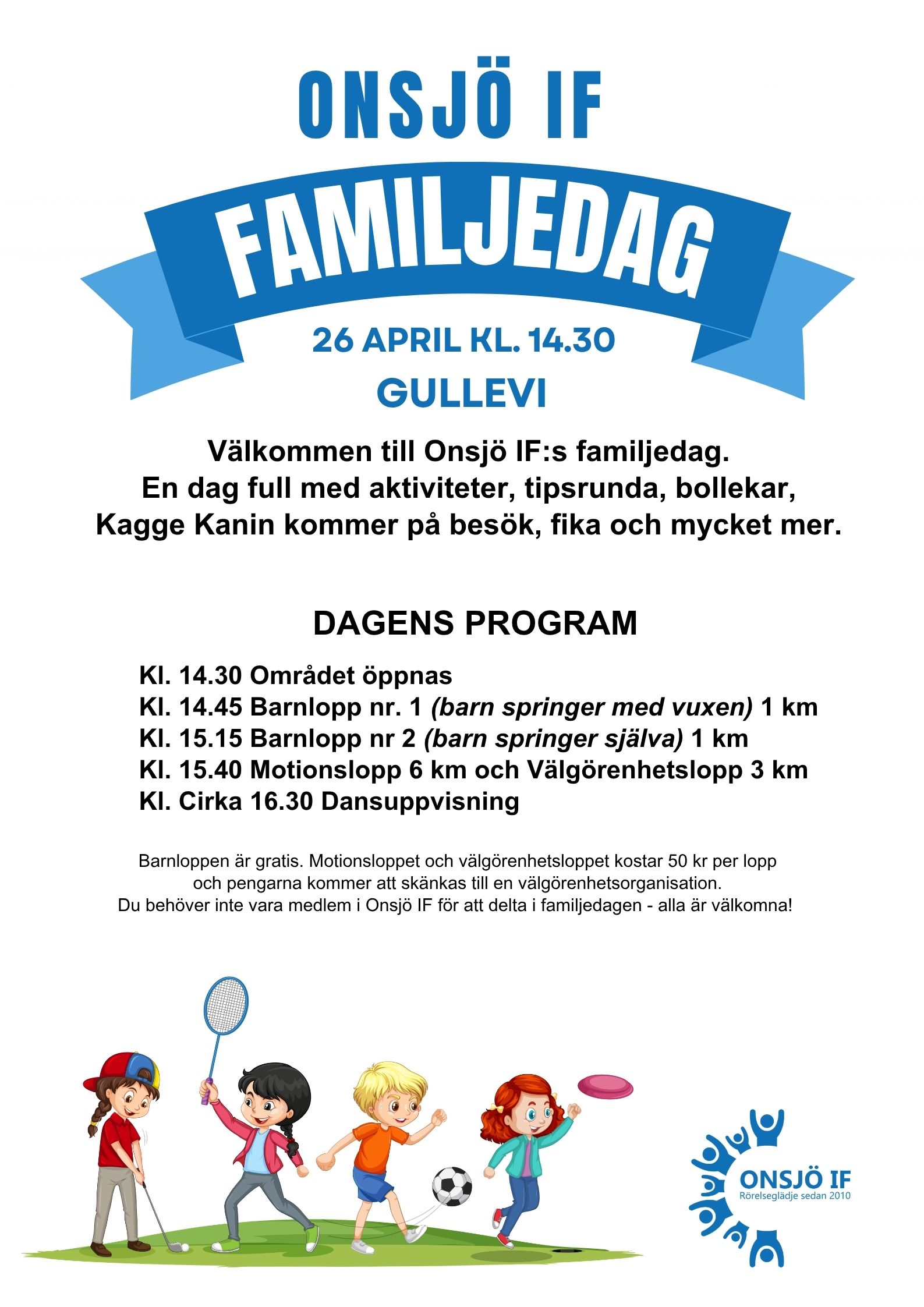 Nu var det äntligen dags igen. Häng på med rörelseglädje och låt barnen delta på ett lopp på 1 km. Alla andra kan prova antingen 3 eller 6 km där startavgiften går till välgörenhet. Kom och kika på vad föreningen kan erbjuda och missa inte barngruppens dansuppvisning!